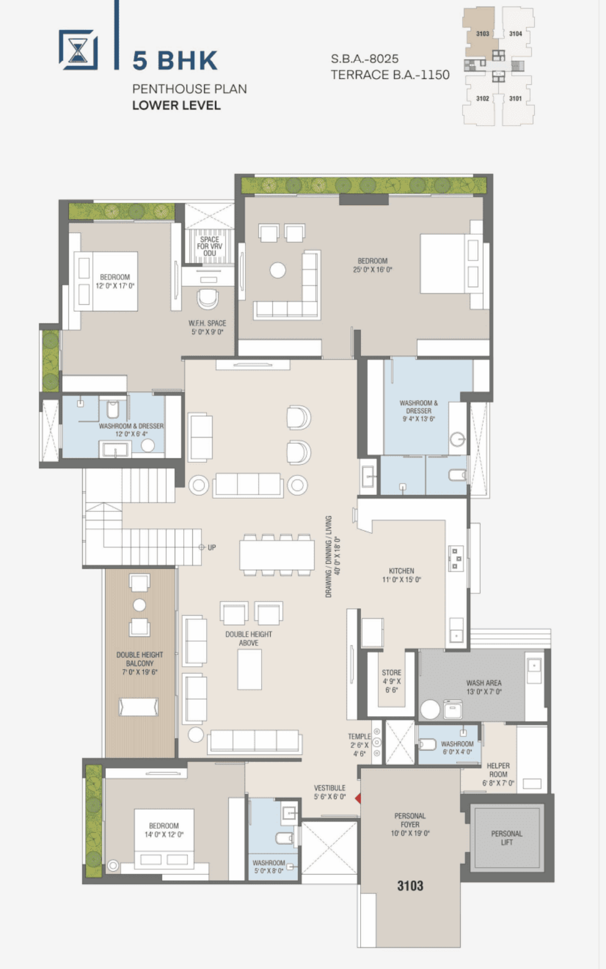 | 5 BHK PENTHOUSE | 8025 SQFT + 1150 SQFT TERRACE | 3640 SQFT | Request On Call |